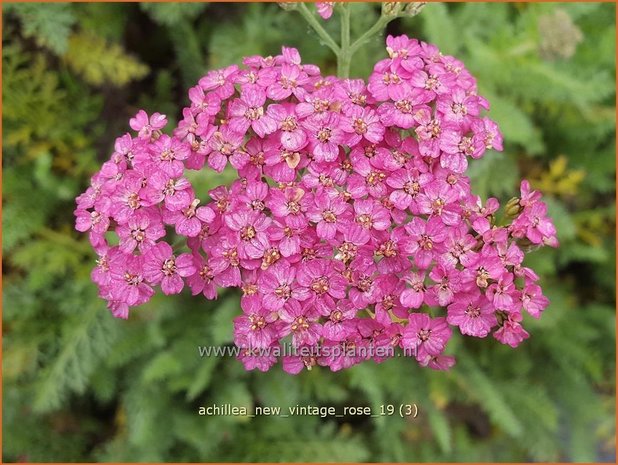 Algemene informatie over Gewoon duizendblad, Duizendblad (Achillea):Duizendblad zijn lage tot hoge vaste planten voor een zonnige standplaats op normale tot arme grond. Het blad van Duizendblad is varenachtig en de plant draagt platte bloemschermen. De bloemen kunnen goed worden gedroogd. Duizendblad is het best te gebruiken in grotere groepen. Knip na de bloei de bloemstengels af om zaadvorming te voorkomen. Dat houdt Duizendblad vitaal en voorkomt dat er zaailingen met onbestemde kleuren in het hart van de plant gaan groeien. Goede buurplanten voor Duizendblad zijn bijv. Bossalie (Salvia), Zonnehoed (Echinacea, Rudbeckia), Hemelsleutel (Sedum) en siergrassen.Gewoon duizendblad - Achillea millefolium 'New Vintage Rose'