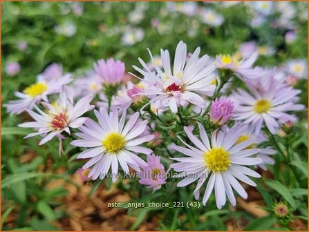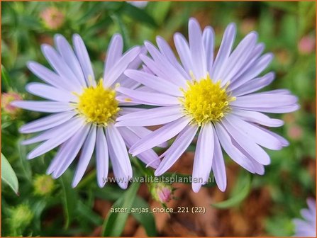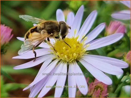 Algemene informatie over Aster (Aster):Asters vormen een groot geslacht van vaste planten. Voor ieder wat wils, in allerlei kleuren en hoogtes. De meeste Asters willen volle zon en het liefst een wat rijke goed doorlatende grond die voldoende vochtig blijft. Na de bloei afknippen om een mooie pol te houden. Om de 3 jaar de Aster even opnemen en de buitenste delen herplanten. De hoge soorten Aster voor in de border laten zich goed combineren met andere planten met een natuurlijke uitstraling zoals bijv. Pimpernel (Sanguisorba), Moerasspirea (Filipendula), Lampenpoetsersgras (Pennisetum), Brandkruid (Phlomis) en Herfstanemoon (Anemone).Aster - Aster 'Anja's Choice'