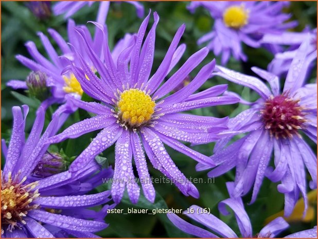 Algemene informatie over Aster (Aster):Asters vormen een groot geslacht van vaste planten. Voor ieder wat wils, in allerlei kleuren en hoogtes. De meeste Asters willen volle zon en het liefst een wat rijke goed doorlatende grond die voldoende vochtig blijft. Na de bloei afknippen om een mooie pol te houden. Om de 3 jaar de Aster even opnemen en de buitenste delen herplanten. De hoge soorten Aster voor in de border laten zich goed combineren met andere planten met een natuurlijke uitstraling zoals bijv. Pimpernel (Sanguisorba), Moerasspirea (Filipendula), Lampenpoetsersgras (Pennisetum), Brandkruid (Phlomis) en Herfstanemoon (Anemone).Aster - Aster 'Blauer Gletscher'