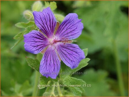 Algemene informatie over Ooievaarsbek, Tuingeranium (Geranium):Ooievaarsbek is een geslacht van planten voor zeer uiteenlopende standplaatsen. Zon, schaduw, vochtige grond, droge grond; er is altijd wel een passende Ooievaarsbek te vinden. Er zijn zowel wintergroene als bladverliezende soorten. De wat grotere soorten Ooievaarsbek zijn perfecte planten voor de border. Naast de vaak langdurige bloei kunnen ze door hun losse en bossige groei ook prima gaten opvullen, bijv. van uitgebloeide voorjaarsbollen. Ook in een natuurlijk aandoende tuin is Ooievaarsbek onmisbaar, bijv. samen met siergrassen en Zonnehoed (Echinacea, Rudbeckia). De laagblijvende soorten Ooievaarsbek zijn ideaal voor gebruik langs paden en in de rotstuin. Als Ooievaarsbek na de bloei wat slordig is, knip ze dan gerust helemaal terug en geef eventueel wat voeding. Ze zullen snel weer fris uitlopen.Ooievaarsbek - Geranium magnificum 'Rosemoor'