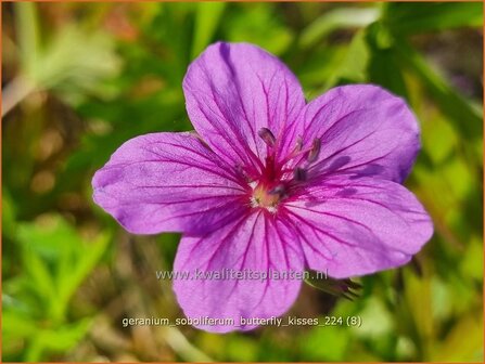 Algemene informatie over Ooievaarsbek, Tuingeranium (Geranium):Ooievaarsbek is een geslacht van planten voor zeer uiteenlopende standplaatsen. Zon, schaduw, vochtige grond, droge grond; er is altijd wel een passende Ooievaarsbek te vinden. Er zijn zowel wintergroene als bladverliezende soorten. De wat grotere soorten Ooievaarsbek zijn perfecte planten voor de border. Naast de vaak langdurige bloei kunnen ze door hun losse en bossige groei ook prima gaten opvullen, bijv. van uitgebloeide voorjaarsbollen. Ook in een natuurlijk aandoende tuin is Ooievaarsbek onmisbaar, bijv. samen met siergrassen en Zonnehoed (Echinacea, Rudbeckia). De laagblijvende soorten Ooievaarsbek zijn ideaal voor gebruik langs paden en in de rotstuin. Als Ooievaarsbek na de bloei wat slordig is, knip ze dan gerust helemaal terug en geef eventueel wat voeding. Ze zullen snel weer fris uitlopen.Ooievaarsbek - Geranium soboliferum 'Butterfly Kisses'