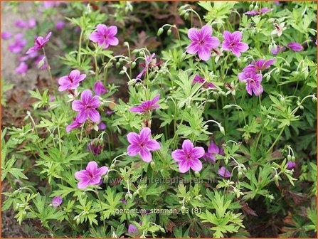 Algemene informatie over Ooievaarsbek, Tuingeranium (Geranium):Ooievaarsbek is een geslacht van planten voor zeer uiteenlopende standplaatsen. Zon, schaduw, vochtige grond, droge grond; er is altijd wel een passende Ooievaarsbek te vinden. Er zijn zowel wintergroene als bladverliezende soorten. De wat grotere soorten Ooievaarsbek zijn perfecte planten voor de border. Naast de vaak langdurige bloei kunnen ze door hun losse en bossige groei ook prima gaten opvullen, bijv. van uitgebloeide voorjaarsbollen. Ook in een natuurlijk aandoende tuin is Ooievaarsbek onmisbaar, bijv. samen met siergrassen en Zonnehoed (Echinacea, Rudbeckia). De laagblijvende soorten Ooievaarsbek zijn ideaal voor gebruik langs paden en in de rotstuin. Als Ooievaarsbek na de bloei wat slordig is, knip ze dan gerust helemaal terug en geef eventueel wat voeding. Ze zullen snel weer fris uitlopen.Ooievaarsbek - Geranium soboliferum 'Starman'