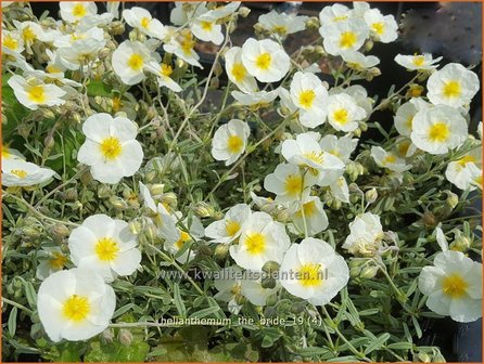 Algemene informatie over Zonneroosje (Helianthemum):Zonneroosjes zijn langbloeiende, wintergroene halfheestertjes die graag in de volle zon staan op een droge grond. Zonneroosje is onmisbaar in de rotstuin, maar doet het ook goed in droge bloembakken, waar de uitlopers mooi over de rand hangen. Na de bloei de Zonneroosjes eventueel iets terugknippen. Dat houdt de planten vitaal en compact. Staan ze 's winters op een plek waar de koude oostenwind vrij overheen waait, dan is het goed om ze wat af te dekken met een laagje blad. Zonneroosje is te combineren met bijv. Schapengras (Festuca), Scheefbloem (Iberis), Rotsanjer (Dianthus) en Zwaardlelie (Iris).Zonneroosje - Helianthemum 'The Bride'