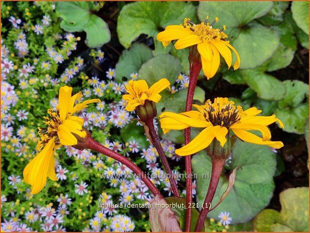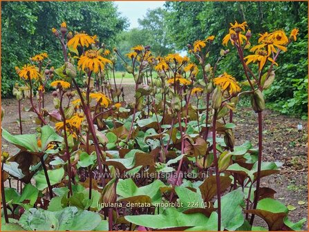 Bijzonder mooi zijn de soorten met warmgele bloemen en bruin blad. Het zijn flinke planten die graag wat extra compost in het voorjaar krijgen. Het duurt enkele jaren voordat Kruiskruid volwassen is. Slakken houden ook van Kruiskruid. Strooi tijdig in het voorjaar milieuvriendelijke slakkenkorrels. Combineer Ligularia met bijv. Daglelie (Hemerocallis), Koninginnekruid (Eupatorium), Geitenbaard (Aruncus) en Pluimspirea (Astilbe).Kruiskruid - Ligularia dentata 'Moorblut'