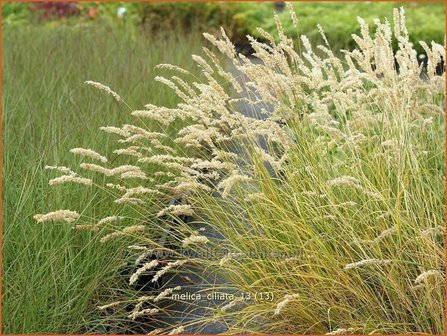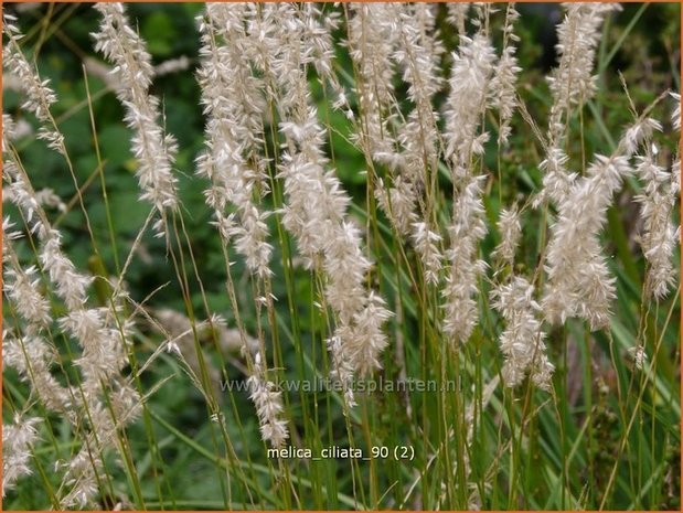 Algemene informatie over Wimperparelgras, Parelgras (Melica):Wimperparelgras is een middelhoog gras dat graag op een plek in de zon tot halfschaduw staat. De grond mag normaal tot droog zijn. Wimperparelgras heeft een prachtige bloeiwijze, als een mini-lampenpoetsersgras. Helaas kan de plant zich ook behoorlijk uitzaaien. Wordt dat hinderlijk, knip dan tijdig de uitgebloeide aren uit de plant en gebruik ze eventueel bij het bloemschikken. Pas Wimperparelgras toe in een natuurlijke aanplant, bijv. samen met Spoorbloem (Centranthus), Dropplant (Agastache) en Gele kamille (Anthemis).Wimperparelgras - Melica ciliata