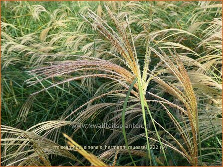 De bloei van Chinees riet begint in de nazomer en is vaak spectaculair. De uitgebloeide pluimen geven een mooi winterbeeld. Er zijn enkele soorten die alleen na een lange warme zomer bloeien. Knip Chinees riet pas in het voorjaar terug, zodra de jonge scheuten tussen de oude stengels zichtbaar worden. Het zijn veelzijdige planten die in geen enkele tuin of border mogen ontbreken.Chinees prachtriet - Miscanthus sinensis 'Hermann Müssel' (pot 11 cm)