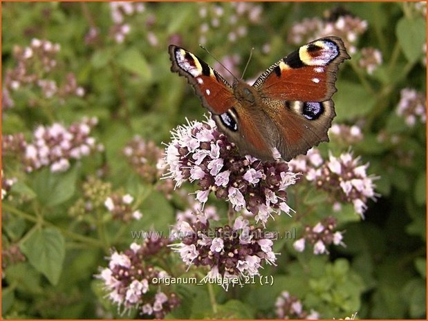 Algemene informatie over Wilde marjolein, Palingkruid (Origanum):Origanum is een kruidachtige plant voor de volle zon op een normale tot droge grond die goed waterdoorlatend is. Origanum kennen we vooral vanwege zijn toepassing in de keuken, maar er zijn ook soorten gekweekt waar de nadruk meer op de bloemen en bladeren ligt. Voor gebruik in de keuken is Origanum vulgare het meest geschikt. Origanum kan zich onder goede omstandigheden flink uitbreiden door worteluitlopers en uitzaaien. Haal bij de cultivars tijdig de uitgebloeide bloemen weg om soortechte planten te houden. De soort Origanum rotundifolium heeft bloemen die op een hopbel of garnaal lijken. Deze soorten zijn meestal iets minder winterhard. Gebruik ze in de rotstuin of in een pot op het terras, waarbij de bellen mooi over de rand van de pot hangen. Origanum trekt veel vlinders en andere insecten en is daardoor een prima plant voor een vlindertuin. Goede partners zijn andere droogteminners zoals bijv. Sedum, Stachys byzantina, Hypericum, Potentilla en Lavandula.Wilde marjolein - Origanum vulgare