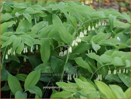 Algemene informatie over Veelbloemige salomonszegel, Gewone salomonszegel (Polygonatum):Veelbloemige salomonszegel is een langzaam groeiende vaste bosplant. Veelbloemige salomonszegel groeit met lange stengels uit de grond. Aan de onderkant in de bladoksels vormt Veelbloemige salomonszegel hangende bloemen die uitgroeien tot kleine besjes. Veelbloemige salomonszegel groeit graag in de (half)schaduw op een humusrijke grond. Meer zon kan, maar dan moet de grond voldoende vochtig zijn. Het blad van Veelbloemige salomonszegel kleurt vaak prachtig geel in de herfst. Plant voor een mooie combinatie bijv. varens, Hosta (Hosta), Japans bosgras (Hakonechloa) en Donkere ooievaarsbek (Geranium) naast Kranssalomonszegel.Veelbloemige salomonszegel - Polygonatum multiflorum