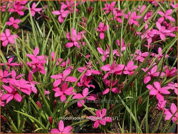 Algemene informatie over Roodsterretje, Sterretjesgras (Rhodohypoxis):Roodsterretje is een geslacht van knolvormende planten met kleine stervormige bloemen. Roodsterretje wil een plek in de volle zon in goed doorlatende grond die aan de zure kant moet zijn. Tijdens de bloei kunnen ze wel wat vocht en voeding gebruiken, maar vermijd een teveel aan vocht in de winter. Roodsterretje is in ons klimaat moeilijk de winter door te krijgen. Ze zijn daarom het beste in potten te houden die 's winters redelijk droog (afdakje) weggezet worden. Op die manier kunnen ze lichte vorst verdragen. Roodsterretje is een dankbaar bloeiende plant voor op de terrastafel.Roodsterretje - Rhodohypoxis milloides