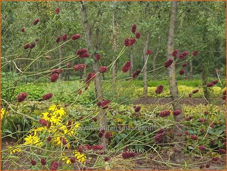 Algemene informatie over Pimpernel, Sorbenkruid (Sanguisorba):Pimpernel is een geslacht van goed winterharde vaste planten. Ze hebben allemaal fijn getand blad en bloemen die zowel staand als hangend kunnen zijn. Pimpernel komt van nature voor op vochtige grond, maar doet het ook prima op een normale grond. Pimpernel is een gemakkelijke plant die graag in de zon tot halfschaduw staat. De plant past goed in een natuurlijke aanplant, bijv. samen met siergrassen. Door zijn losse bloeiwijze is Pimpernel ook een perfecte plant voor gebruik in de border, bijv. gecombineerd met Monnikskap (Aconitum), blauwe Iris (Iris), Kruiskruid (Ligularia, Senecio, Packera) en Lange ereprijs (Veronica).Pimpernel - Sanguisorba 'Tully'